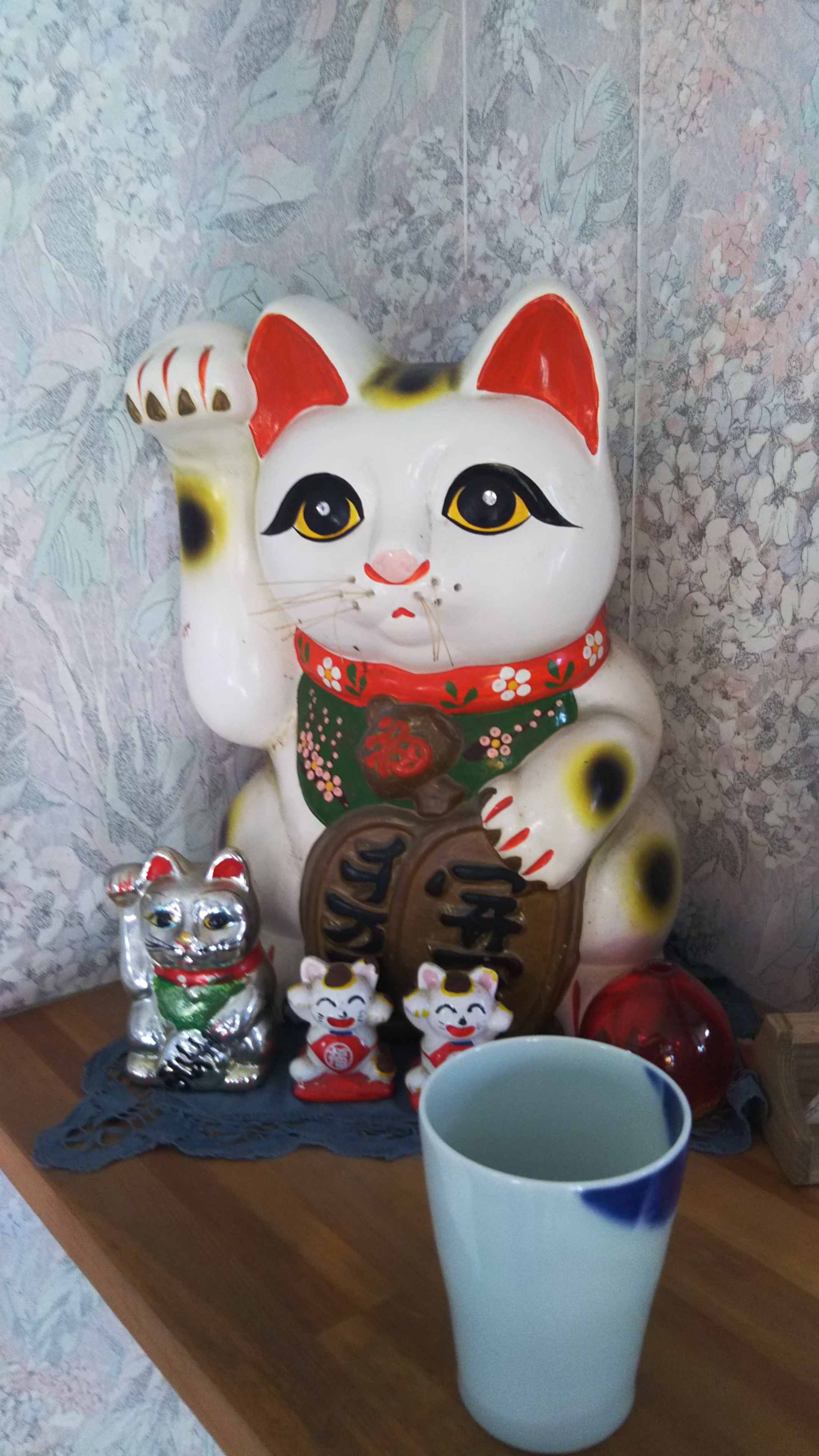 招き猫と一緒に写っている器は、天草大陶磁器展のガラガラくじで当たったのです。
